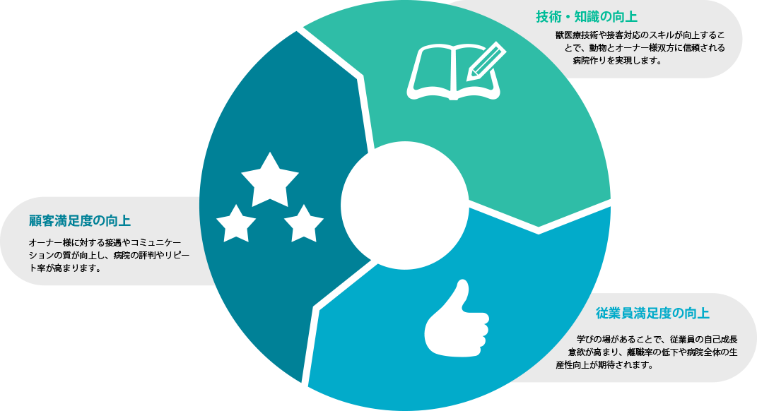 当プログラムは、動物医療業界で働く全ての従業員様が成長し、より良い病院環境を築くための力強いパートナーです。まずはお気軽にご相談ください!